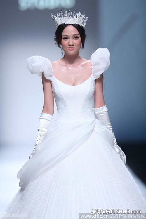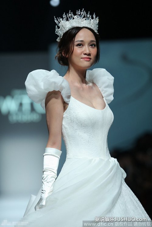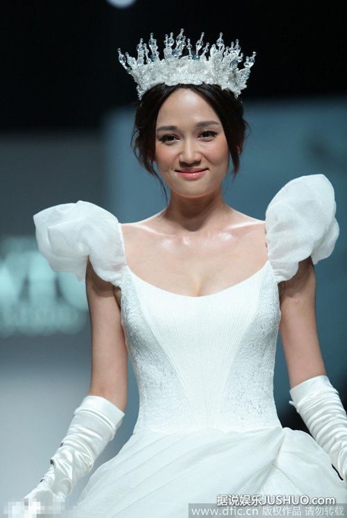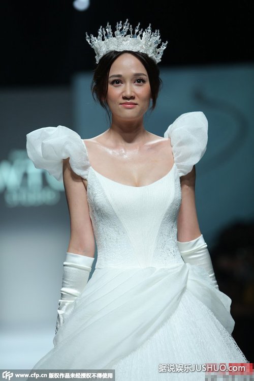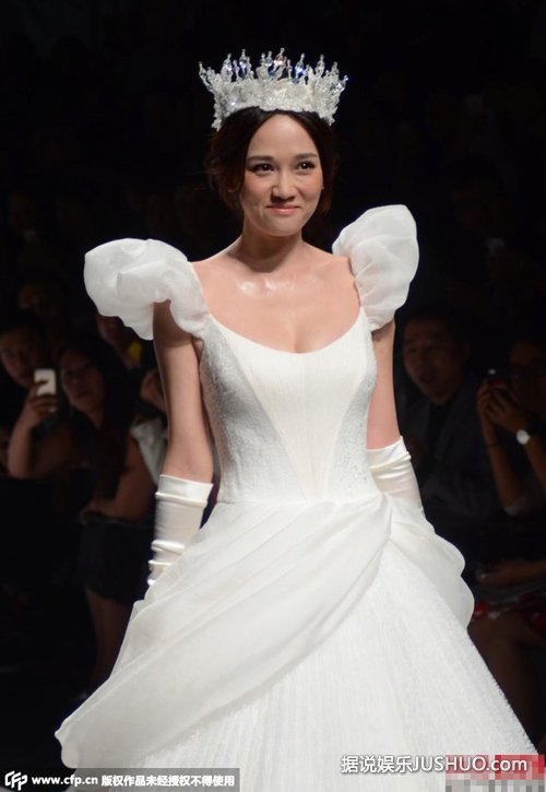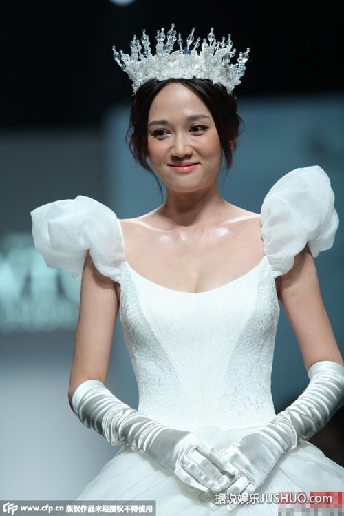 10月20日,台湾女星陈乔恩在上海身着白色婚纱,戴皇冠扮白雪公主优雅走秀。