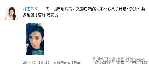 今天(12月13日)凌晨,林志玲在微博上晒出自己的吐舌搞怪照。照片上,林志玲黑纱遮面,睁着大眼睛,俏皮地吐着舌头,有点小委屈的说道:“一天一城市飞飞飞。又爱吃辣的我,不小心长了针眼~哭哭~要多睡觉才会好,晚安啦~”真是惹人怜啊!