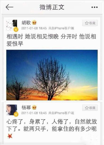 据唐人影视的内部人员透露,杨幂和胡歌曾经有过一段三年的感情,但最后却没能走到一起,彻底分手。就在杨幂1月8日结婚的那天,胡歌还在微博中晒出一张照片,胡杨树,胡代表胡歌,杨代表杨幂,随后杨幂在微博中取消关注胡歌,让很多粉丝心碎。