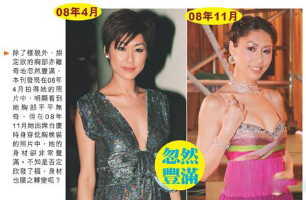 但记者发现她以前拥有一副包包脸的胡定欣,自08年后双眼和鼻梁开始离奇变大变高,越变越靓,她也越来越红,难道人红真的有看样子?近年来也热爱玩微博的胡定欣,最近不时将自己的素颜照放上网给粉丝们看,在5月份她以“喜欢这个我!”为题放了一张素颜照上网,其双眼大旦大了很多,而且鼻梁更挺直了很多,与胡定欣其他近照相比,鼻梁和双眼亦变高变大,离奇变靓。