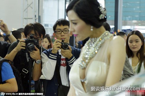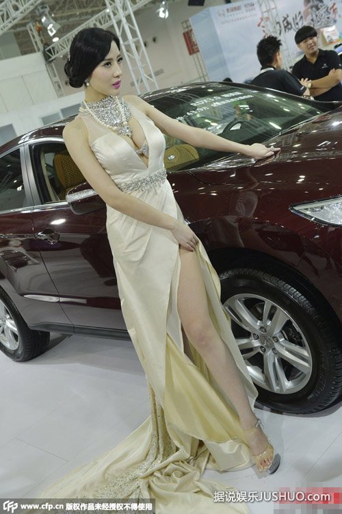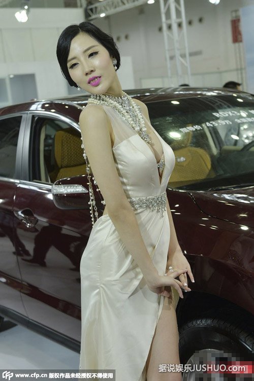 湖北省武汉市,武汉国际车展开幕,嫩模韩盼盼身穿白色开胸长裙秀八字奶,露性感美背身处长腿,车前摆性感S造型引得无数观众围观拍照。