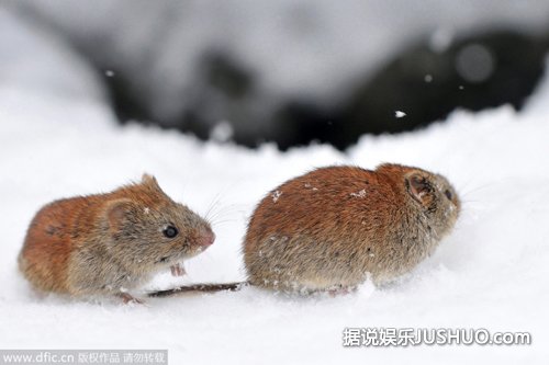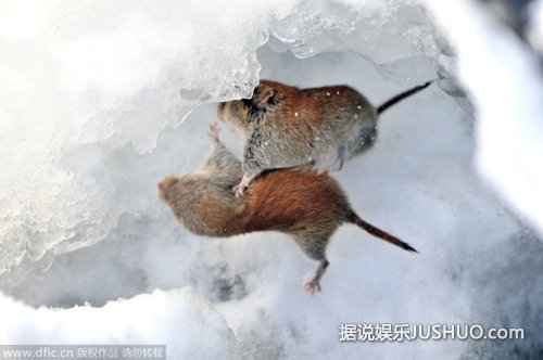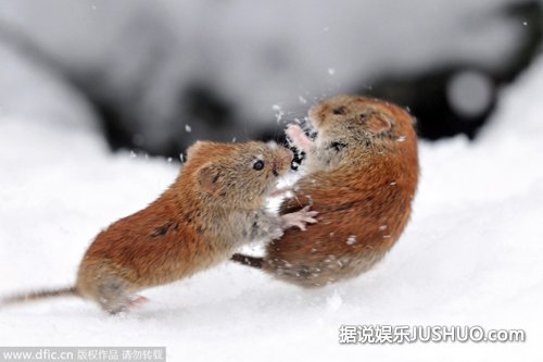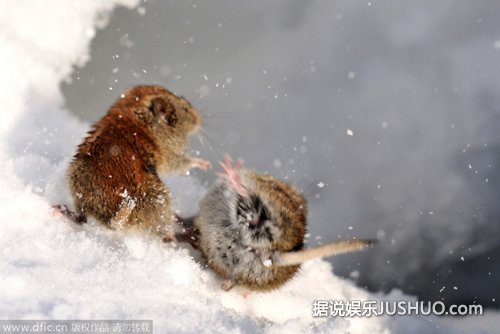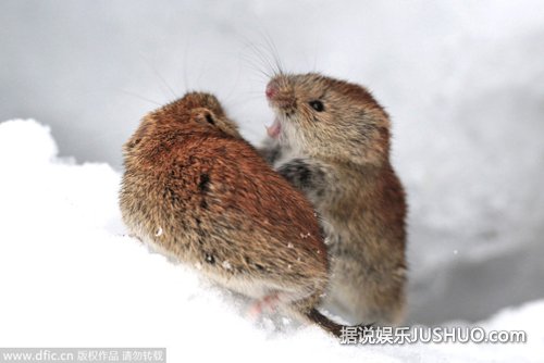 日本北海道,两只田鼠同时相中了一块栖息地,但它们不想和同伴分享,于是乎,便在雪地中扭打了起来,虽然是打架,但姿势实在是太可爱了。
