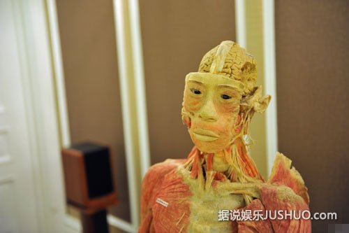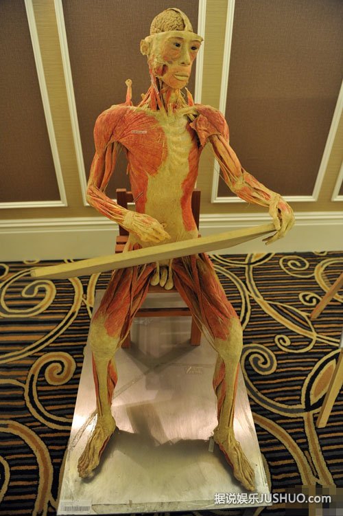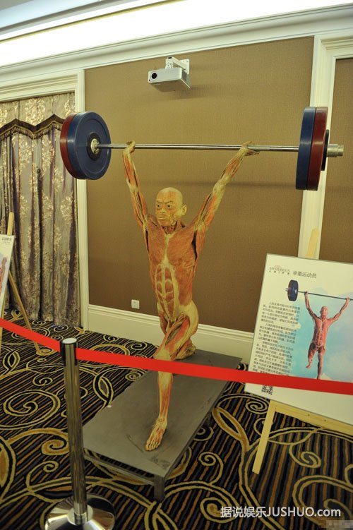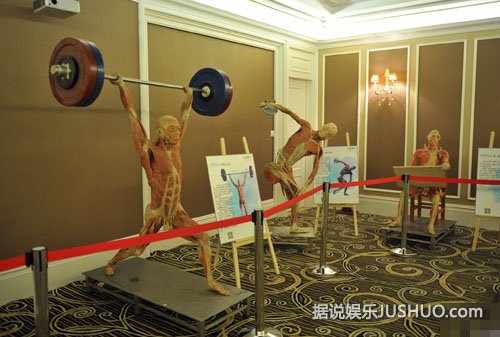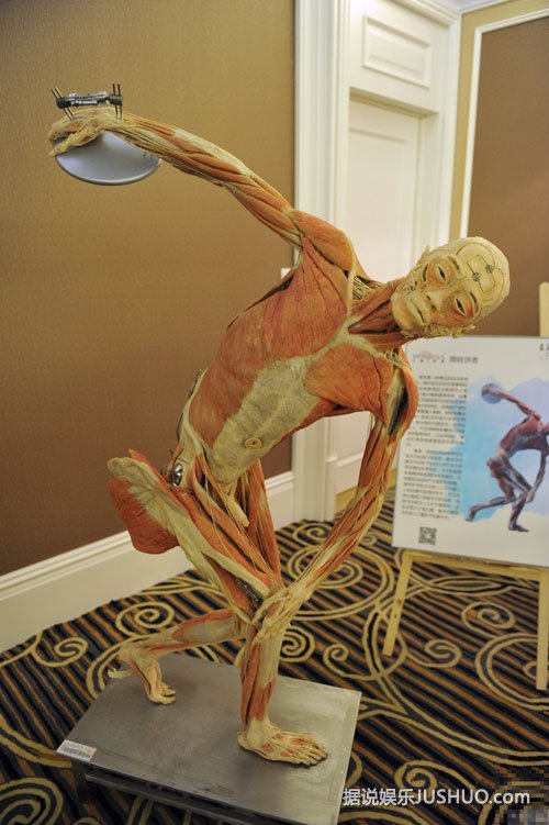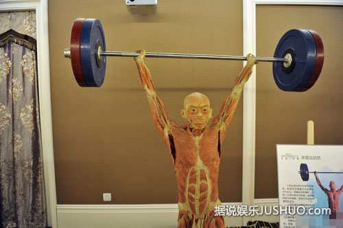 2014年12月11日,辽宁省沈阳市,某地产商在售楼中心举办“人体、海洋生物展”,其中一尊女性人体标本夸张的将自己躯干大开,让观众一目了然,被观众戏称“敞开心扉”。图为现场展示的运动人体标本。