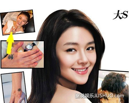 大S全身共有6处文身,分布在颈后、耳朵、虎口、左右脚踝、股沟,尤其是她右手虎口的深蓝色小花非常显眼,是她自己设计的花纹。但大