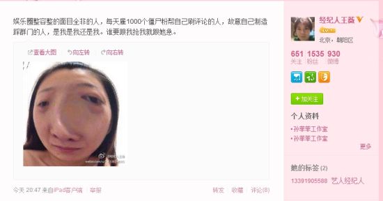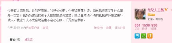今晚,孙菲菲的前经纪人王薇在微博中意有所指地说道:“娱乐圈整容整的面目全非的人,每天雇1000个僵尸粉帮自己刷评论的人,故意自己制造踩裙门的人,是我是我还是我。谁要跟我抢我就跟她急。”随后,她又在微博中表示自己受到了孙菲菲的威胁,“今天有人威胁我,让我等着瞧。我好怕怕啊。今天留微博为证。如果我将来发生什么意外,一定告诉我妈妈害我的那个人她是孙菲菲。她也喜欢动不动的就把律师搬出来吓唬人,我这个人不太会说话也不会动心眼,千万别告我啊。”