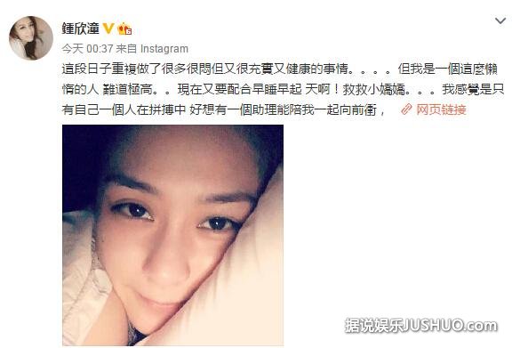 昨晚深夜,钟欣桐在网上发布了一张自己的素颜床照,并配文说:“感觉自己是一个人在拼搏中,好想有一个助理能陪我一起向前行。”